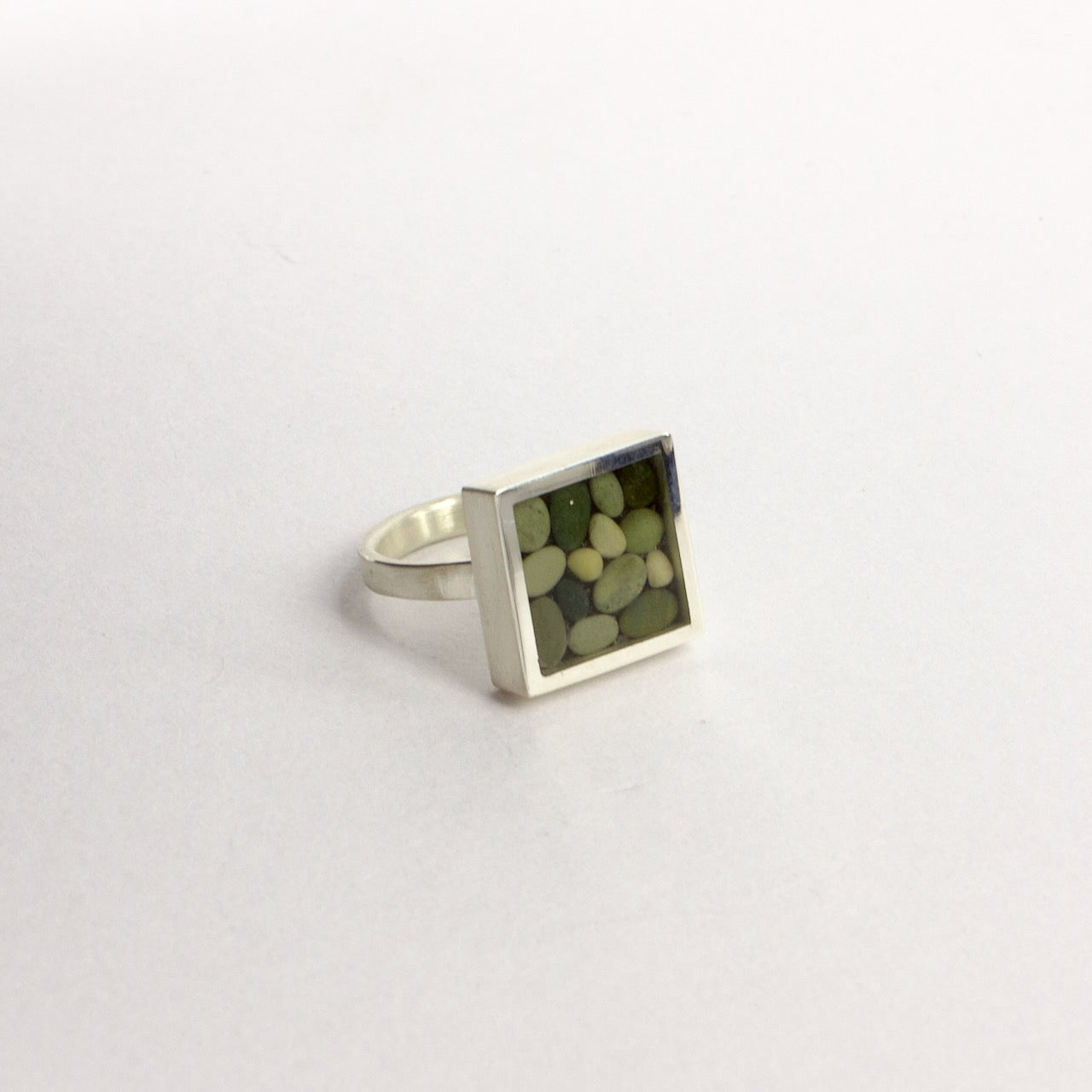 In Anna Claire's characteristic style, tiny green stones from Gemstone beach, near Orepuki on the south coast of Te Wai Pounamu (South Island) are captured in resin, and set within a crisply geometric square setting.