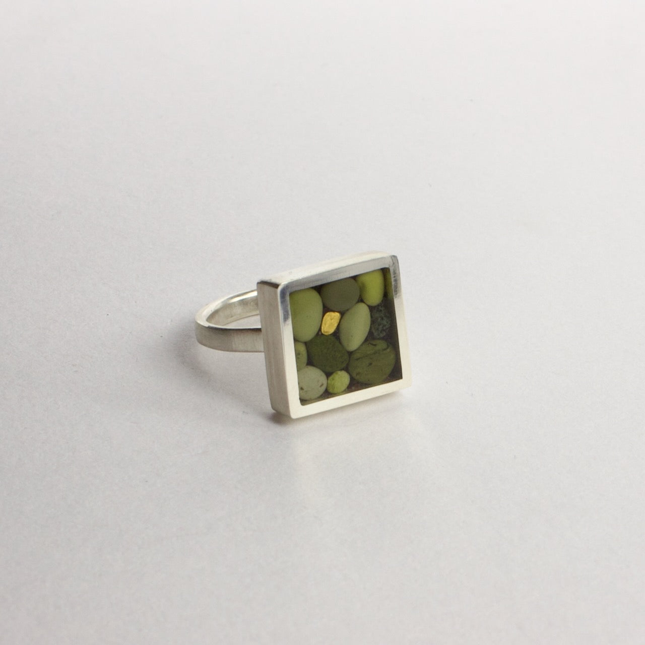 In Anna Claire's characteristic style, tiny green stones from Gemstone beach, near Orepuki on the south coast of Te Wai Pounamu (South Island), and an Arrow River gold nugget from Central Otago are captured in resin, and set within a crisply geometric square setting. A tiny piece of New Zealand to carry with you always.