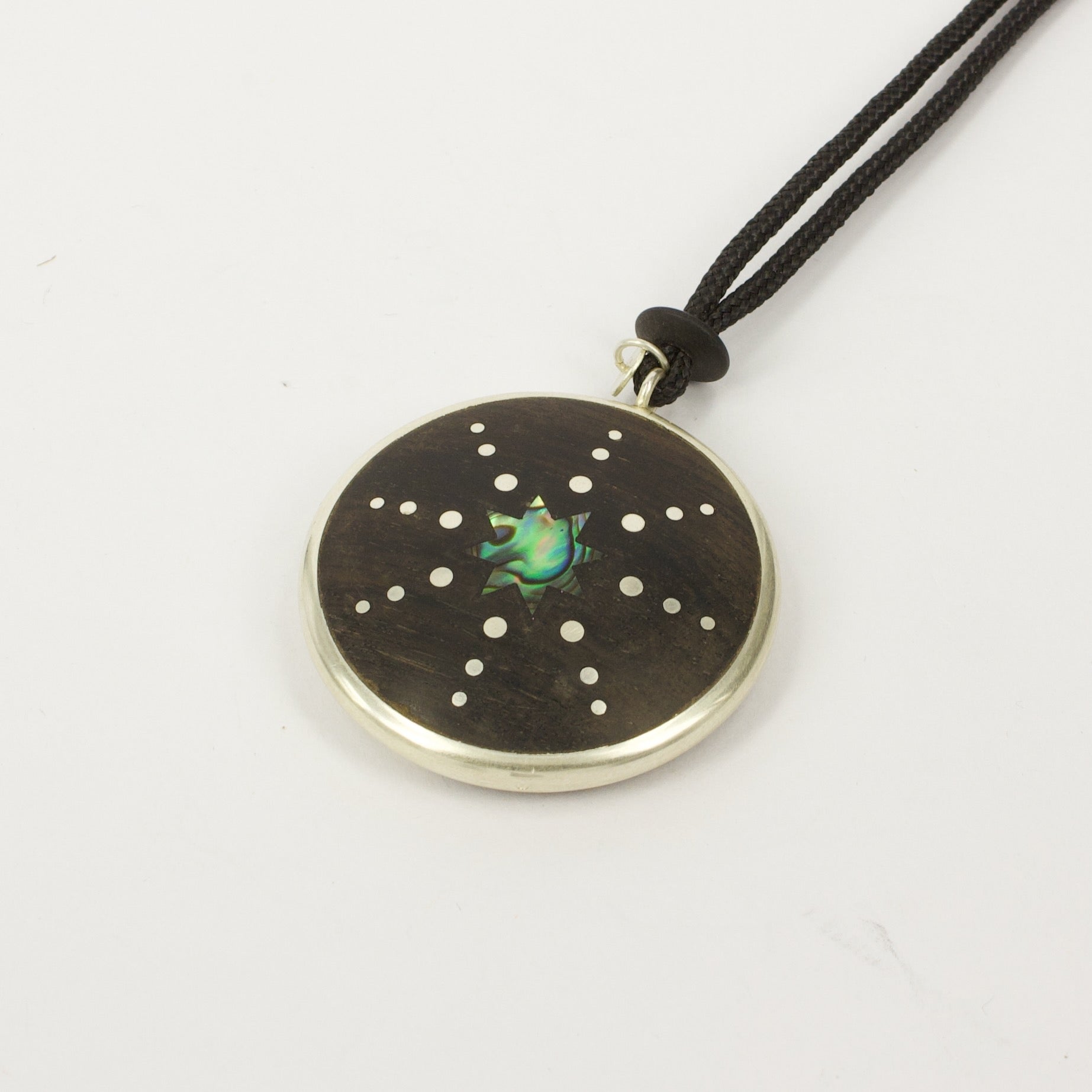 Pendant with double sided design and sterling silver frame - ebony, bone (natural & dyed) kowhai, paua, sterling silver