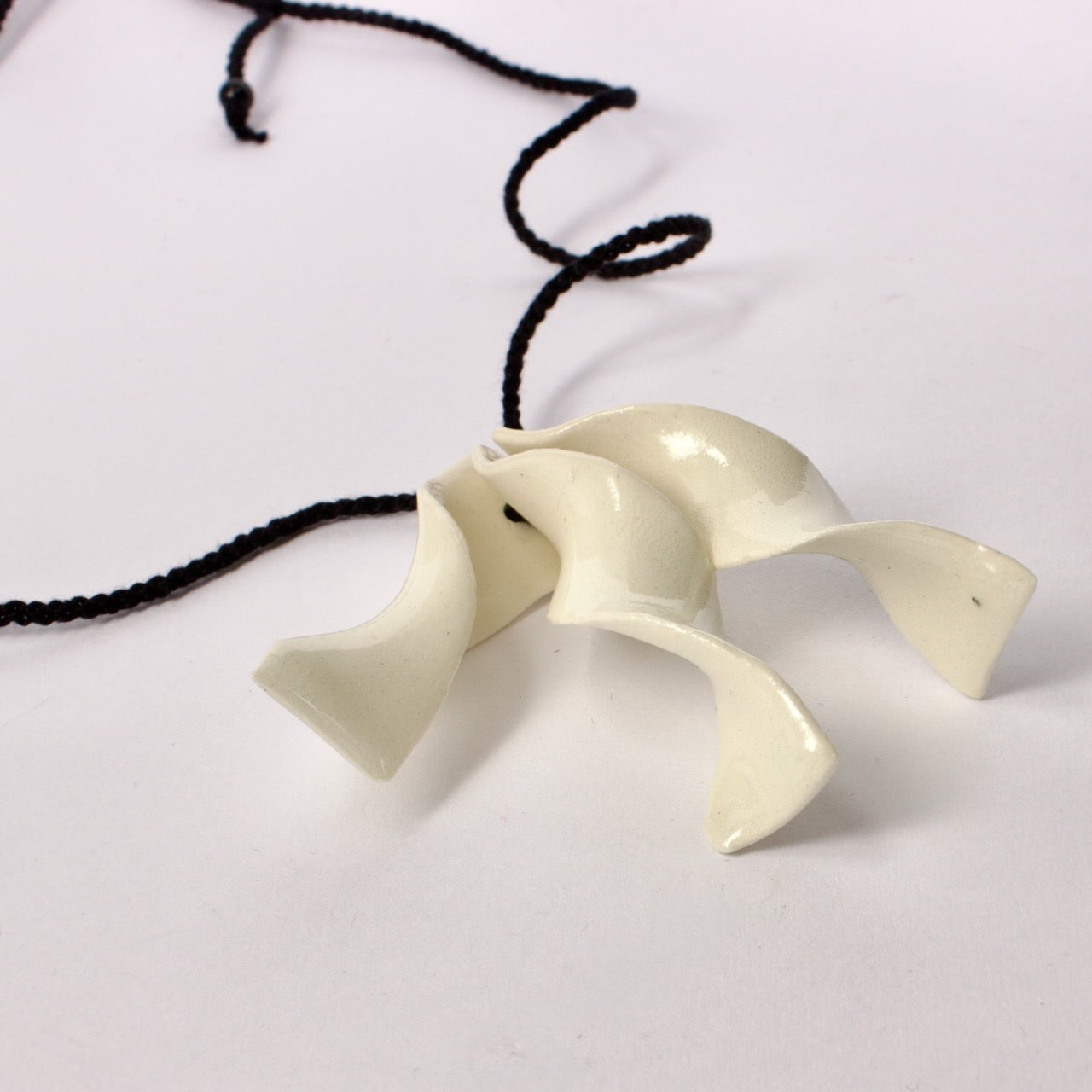 Glazed white ceramic hung on braided black cotton. This is a delicate piece, due to the fine edges on the ceramics.