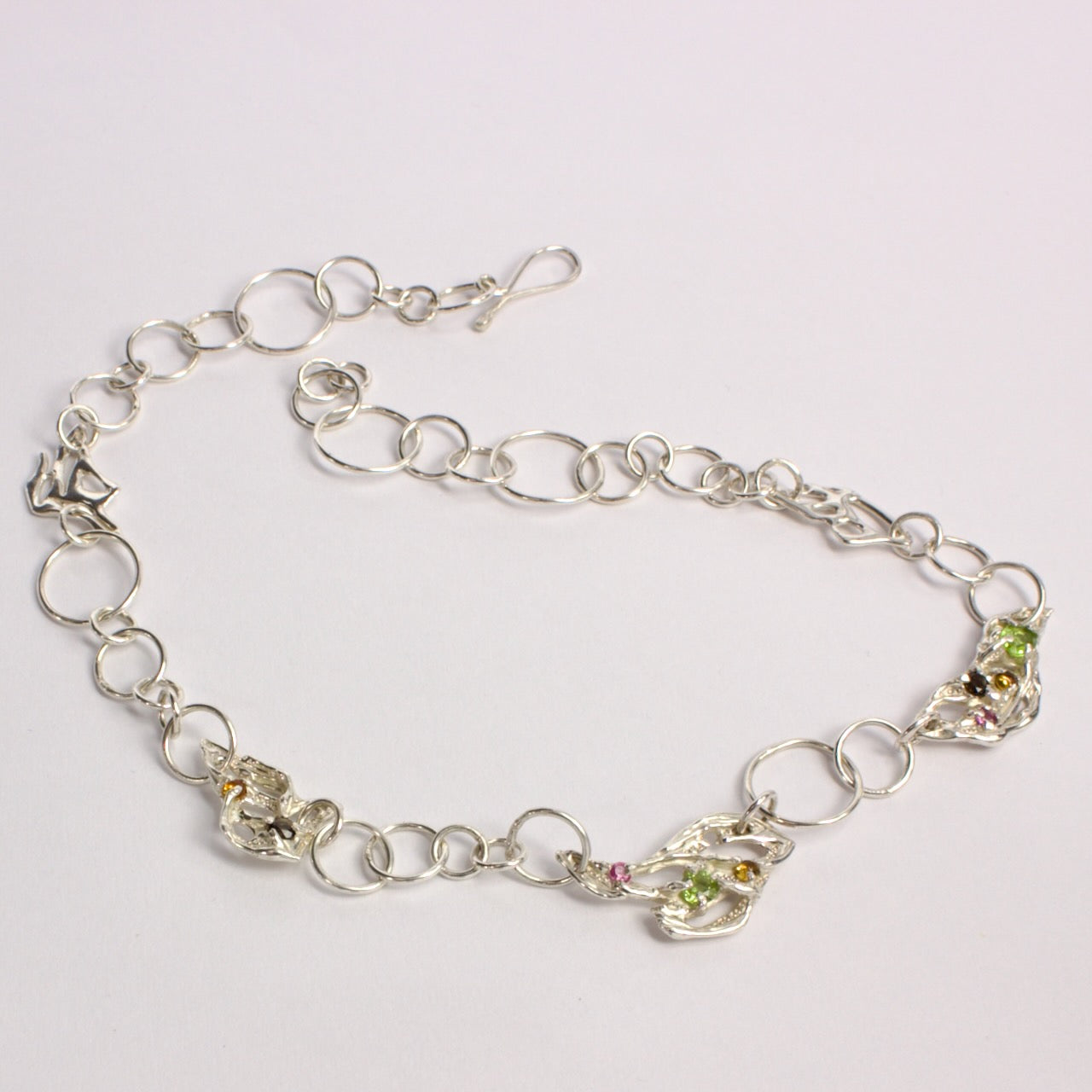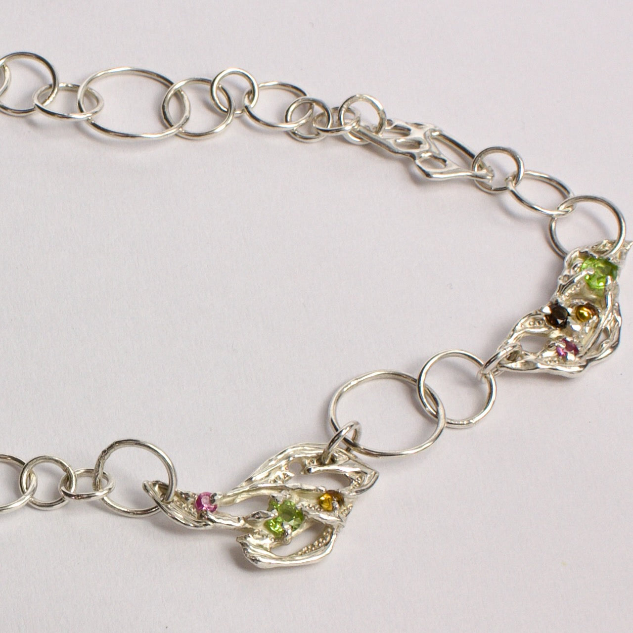 Sterling silver, natural smoky quartz, ntural peridot, natural citrine, created pink sapphires.