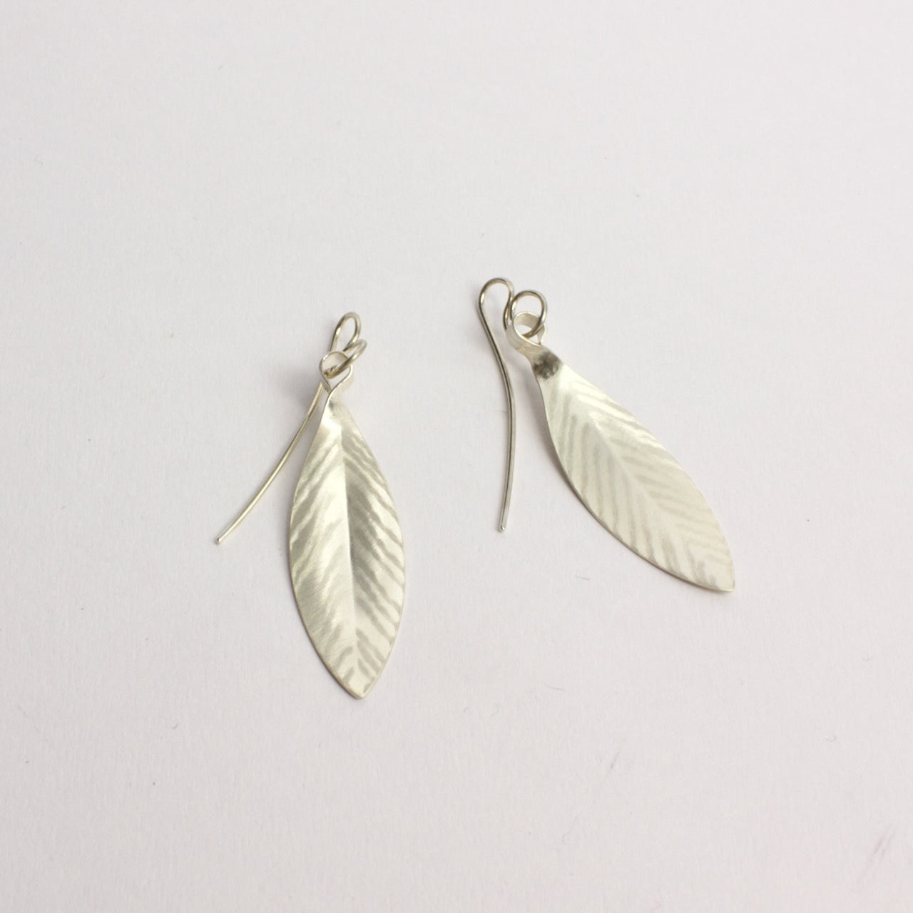 Delicate laurel leaves are formed of sterling silver, and lightly etched to create veins, which creates a an ever changing texture reflecting the light.